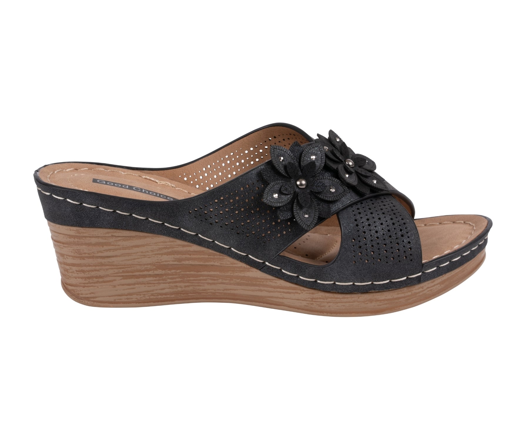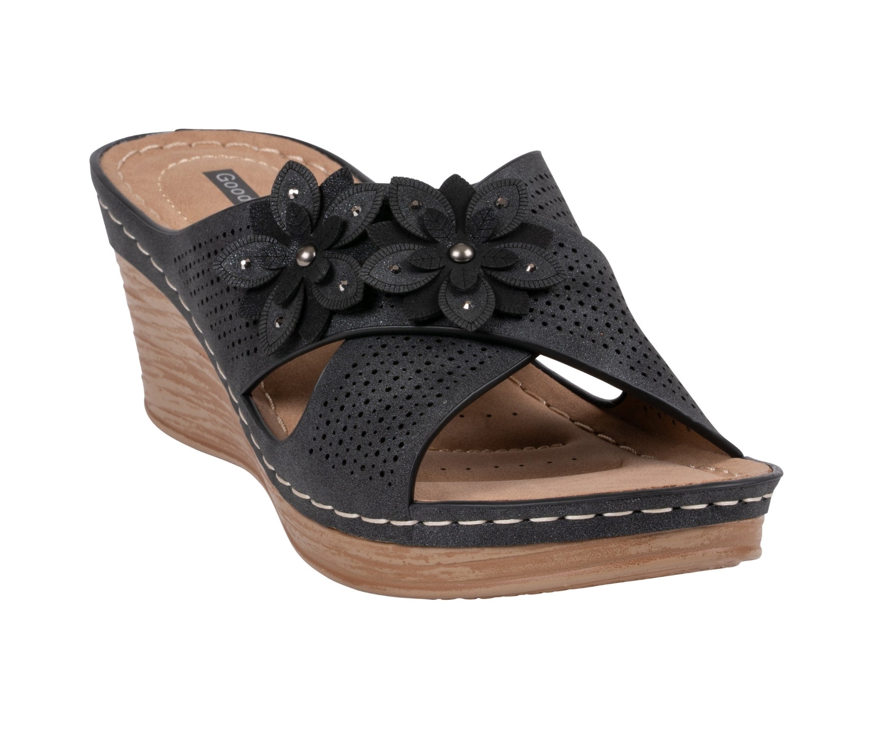 The Nylie sandal by GC Shoes blends feminine charm with everyday comfort. Featuring a laser-cut design and layered floral accents, it offers an airy, elegant look perfect for warm weather. The cushioned footbed and wedge heel provide supportive lift, making Nylie an ideal choice for effortless style from day to evening.